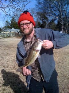 I had packed 2 rods and reels and a small tackle box in the back of the van and had a folder full of Google maps in my tour-book. I had a pretty good shot at some “road fishing” on this run and I was looking forward to escaping to milder climes. After a couple of days of gigs around Jackson, we arrived at the home of Heber Ethridge Jr., father of Matthew’s beloved drummer and mo-ped enthusiast Heber Ethridge the Third (or Tripp, as many in Nashville know him). Tripp had mentioned that his grandfather, Heber Sr. had a nice little pond in his front yard and that we were welcome to come and fish it. So, with some free time in hand, off we went.